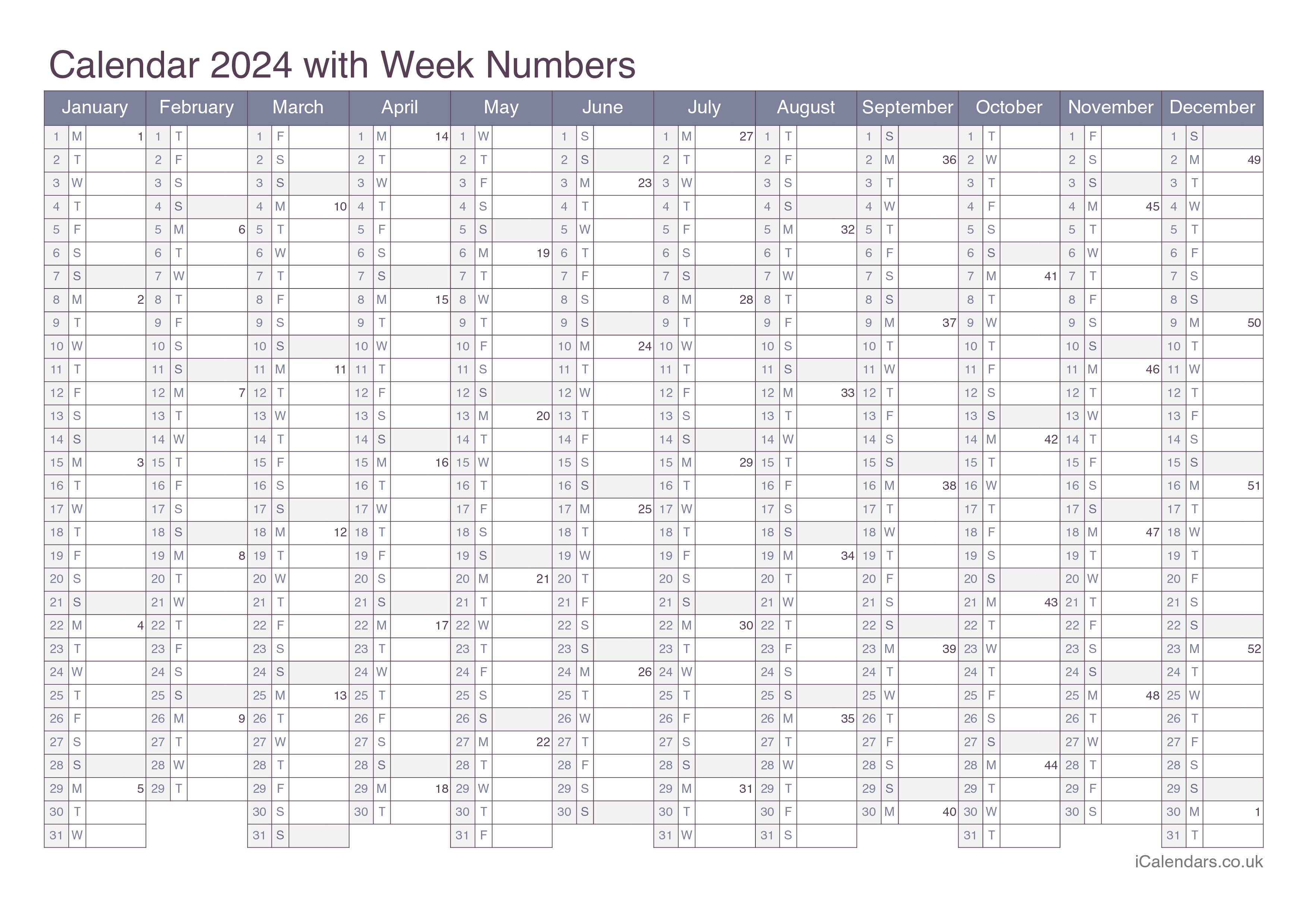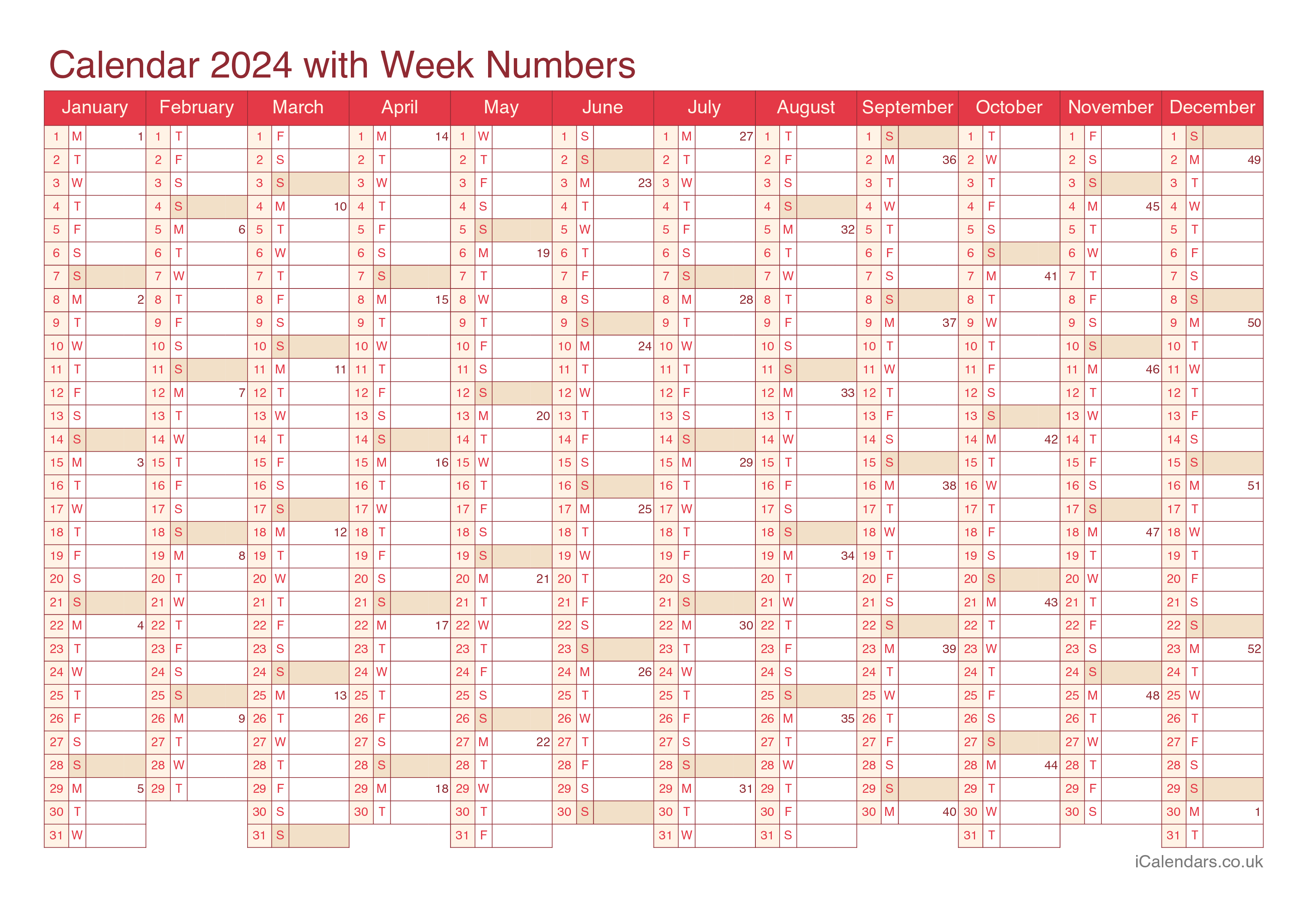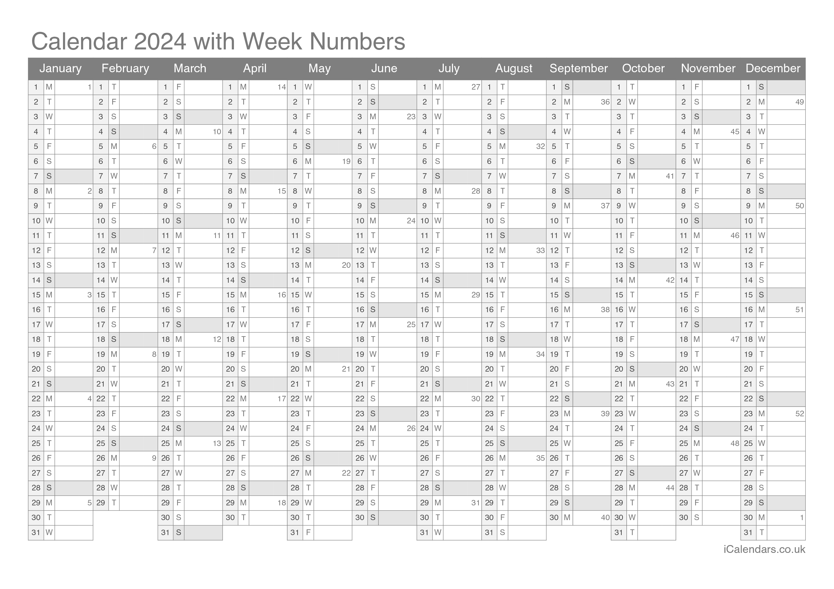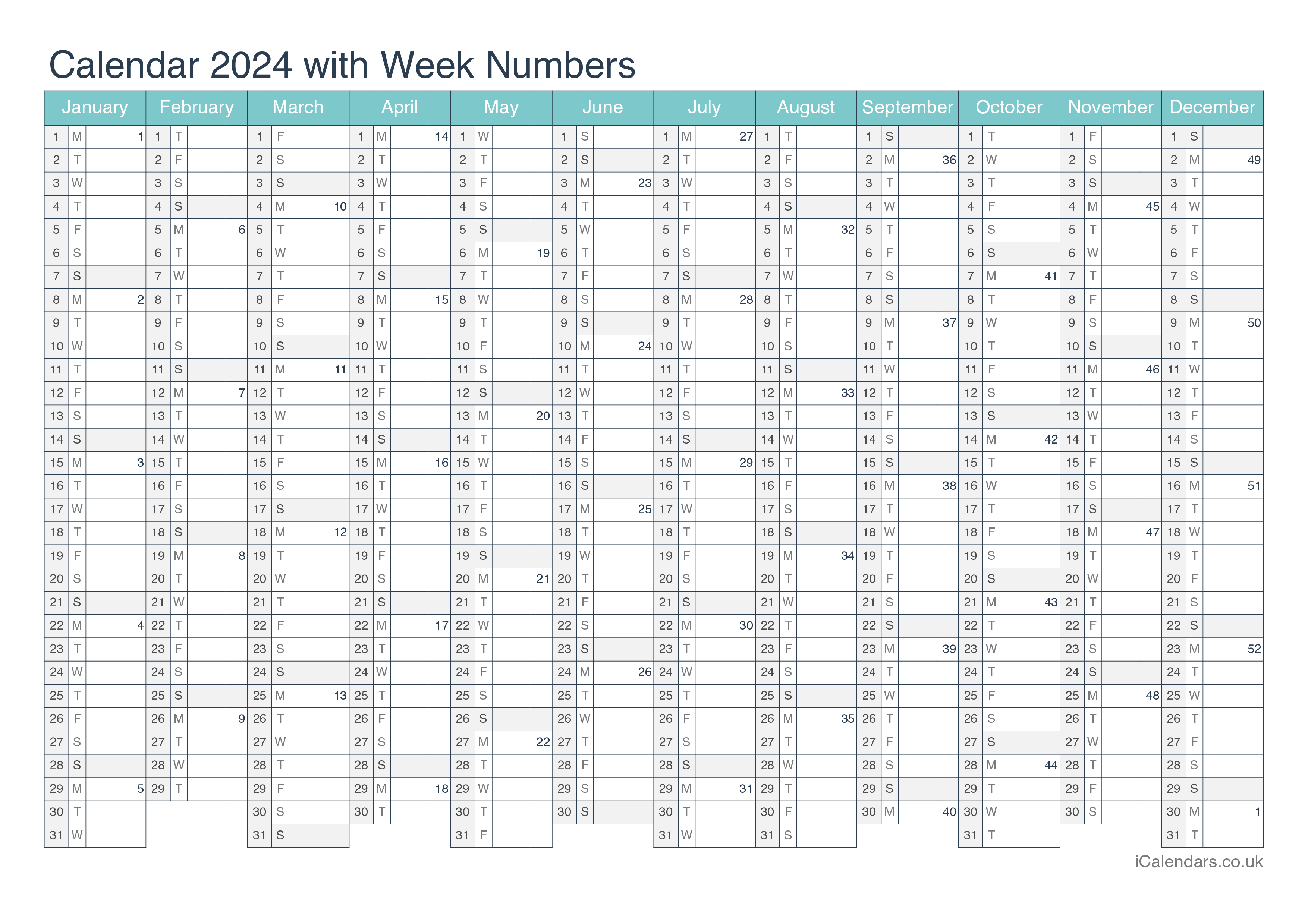 A second version is also available, which displays the week numbers on the Monday of each week.