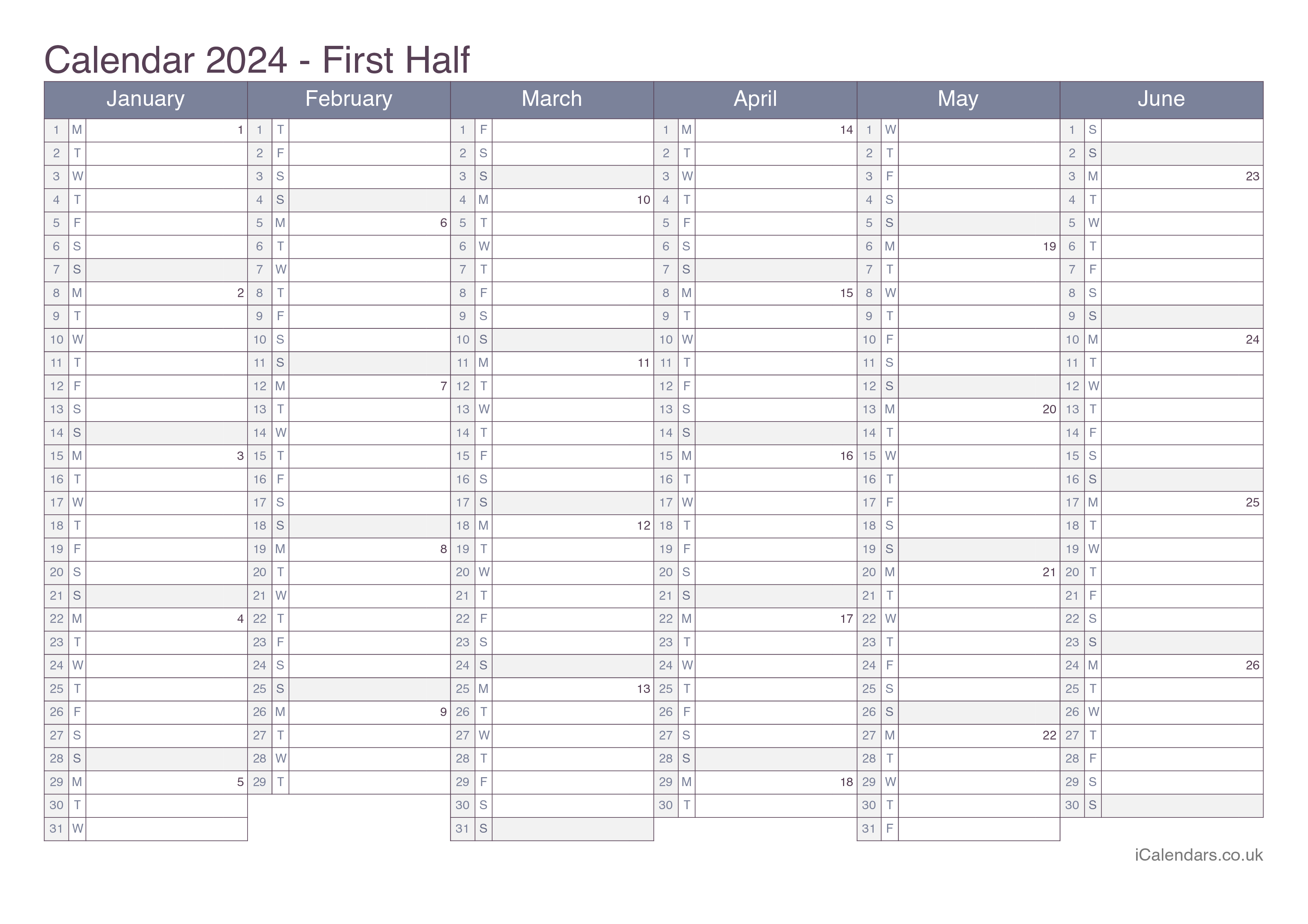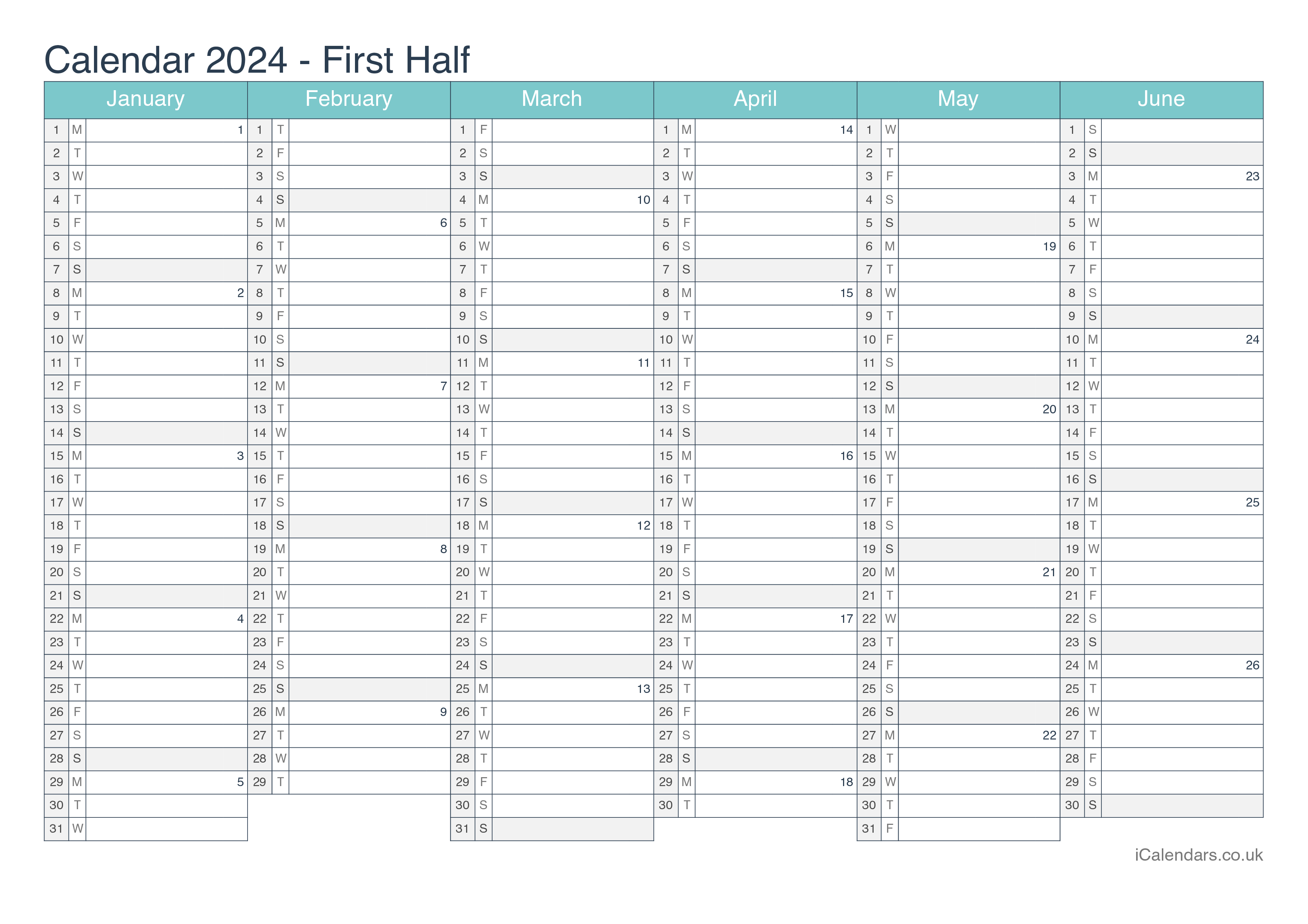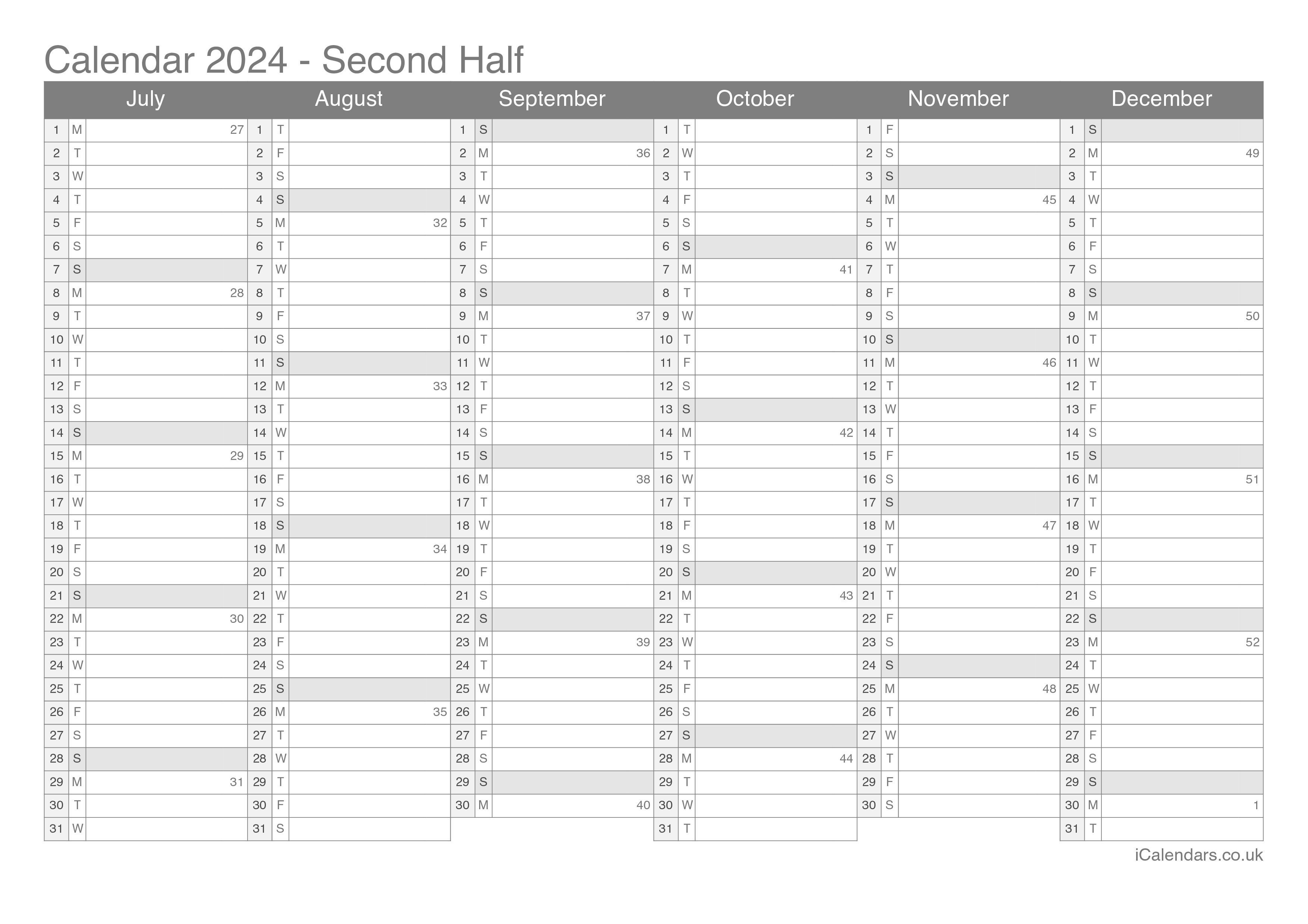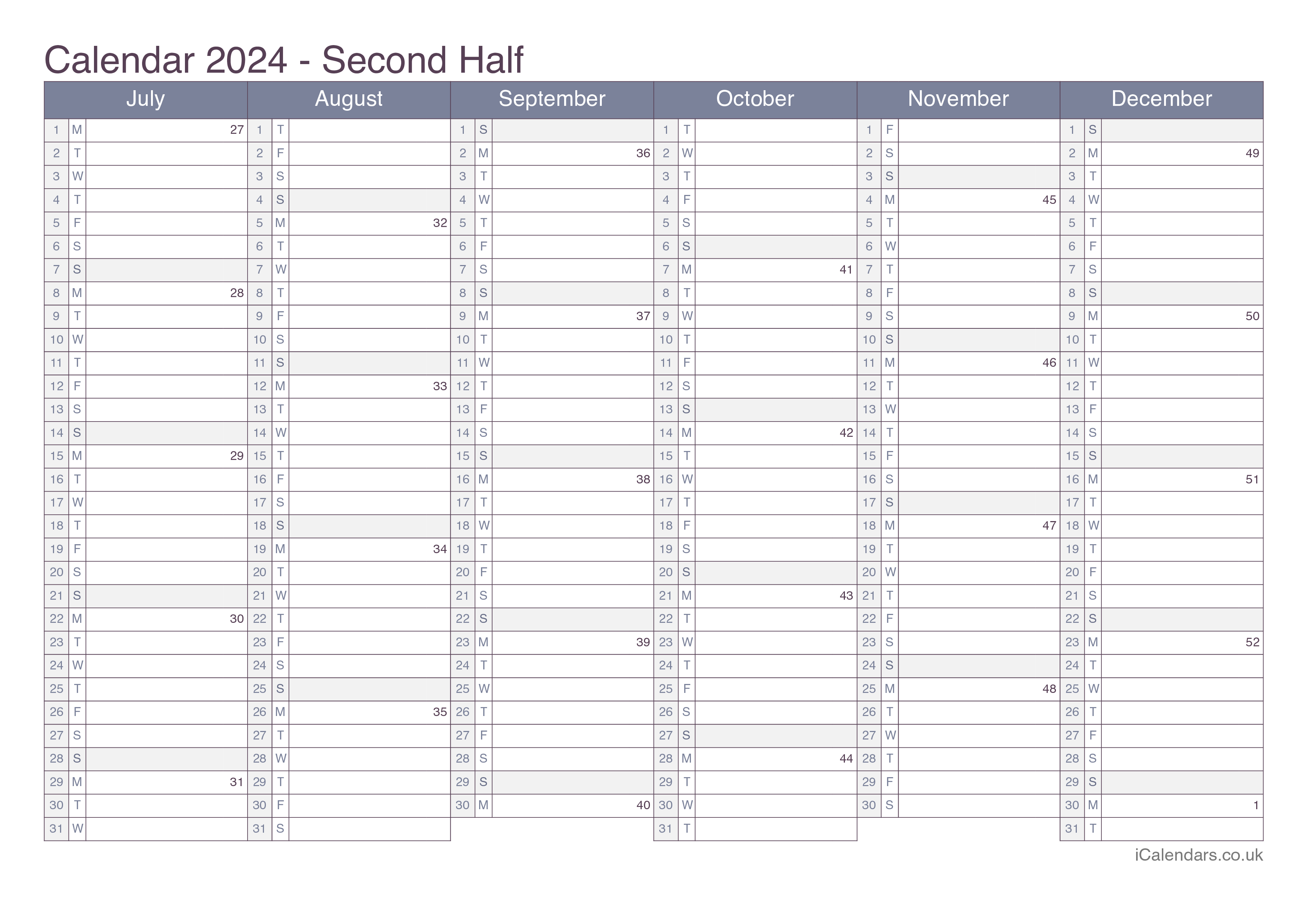 A second version is also available, which displays the week numbers on the Monday of each week.