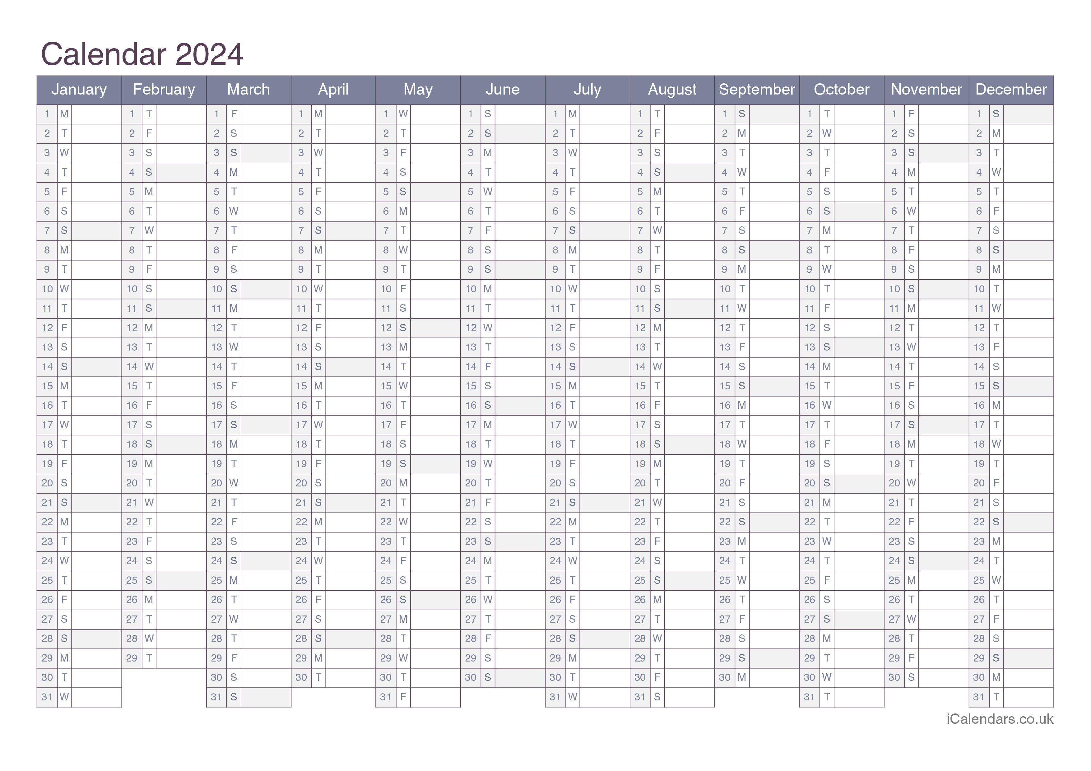 Our calendars are free to use and republish for personal use. This calendar allows you to print the whole year on one page and the template is available as an image, or in PDF and Excel formats.