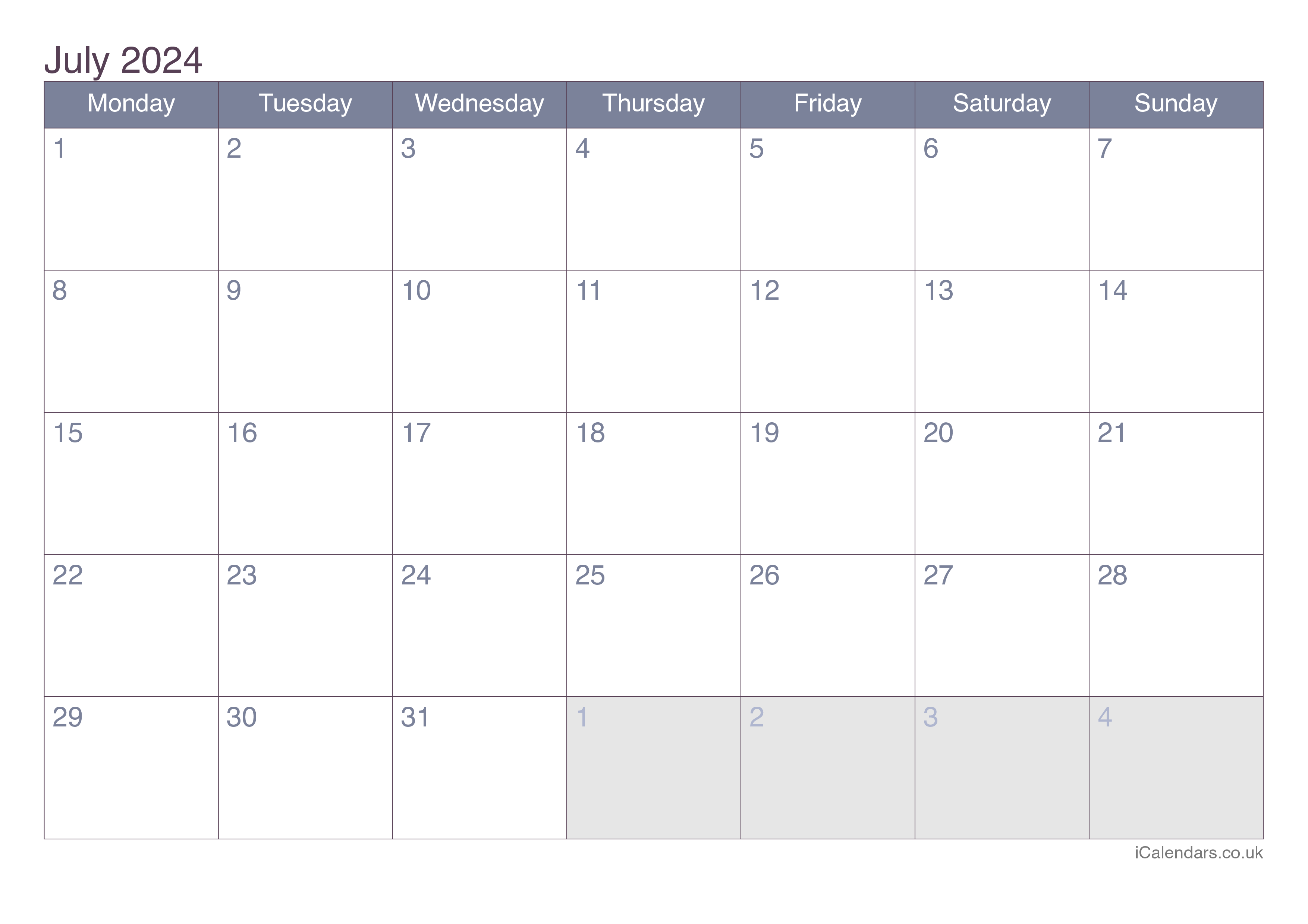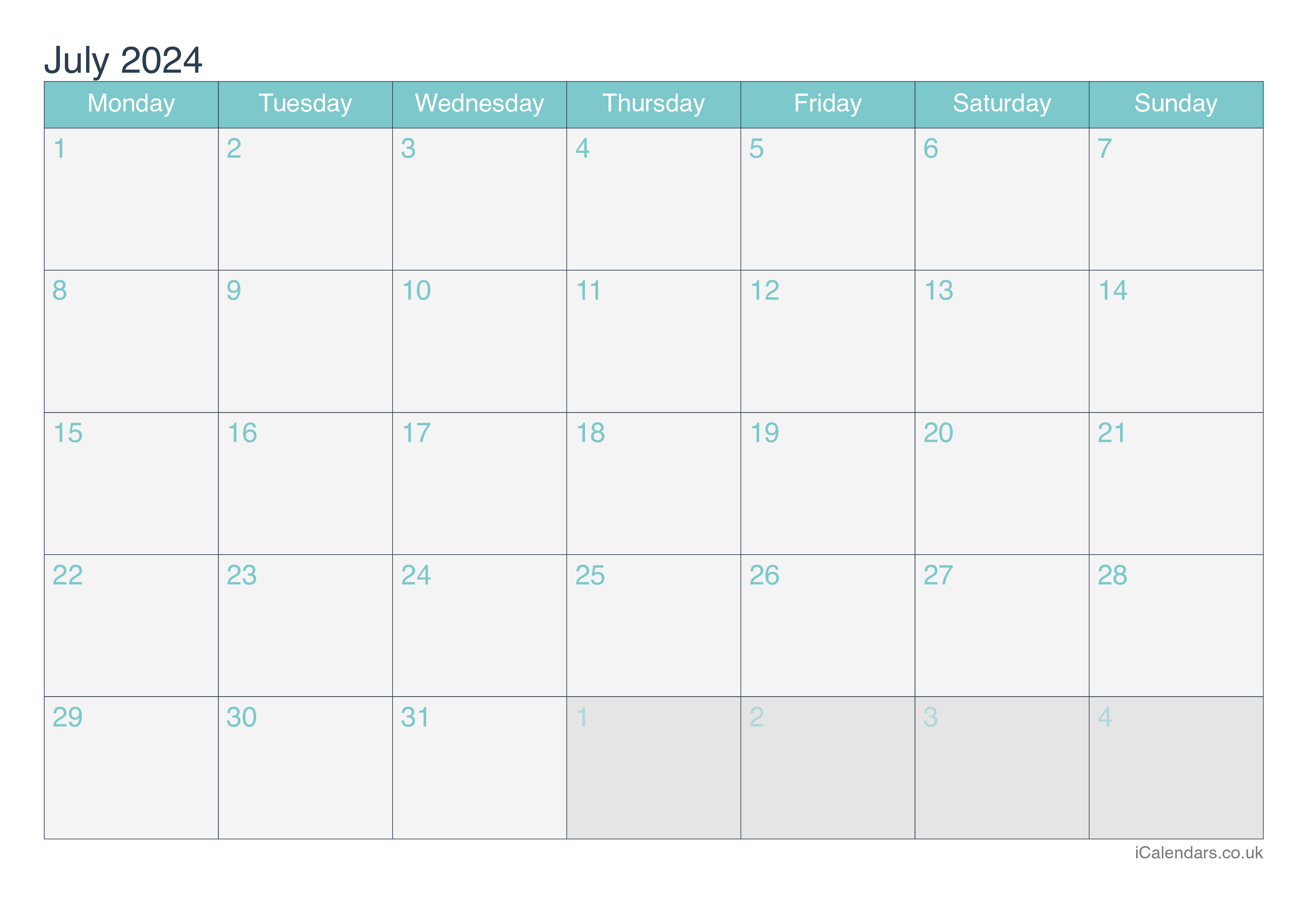 You can download and print this July 2024 calendar. It is available as an image, or in PDF and Excel formats. You can choose one of the 4 colour themes.