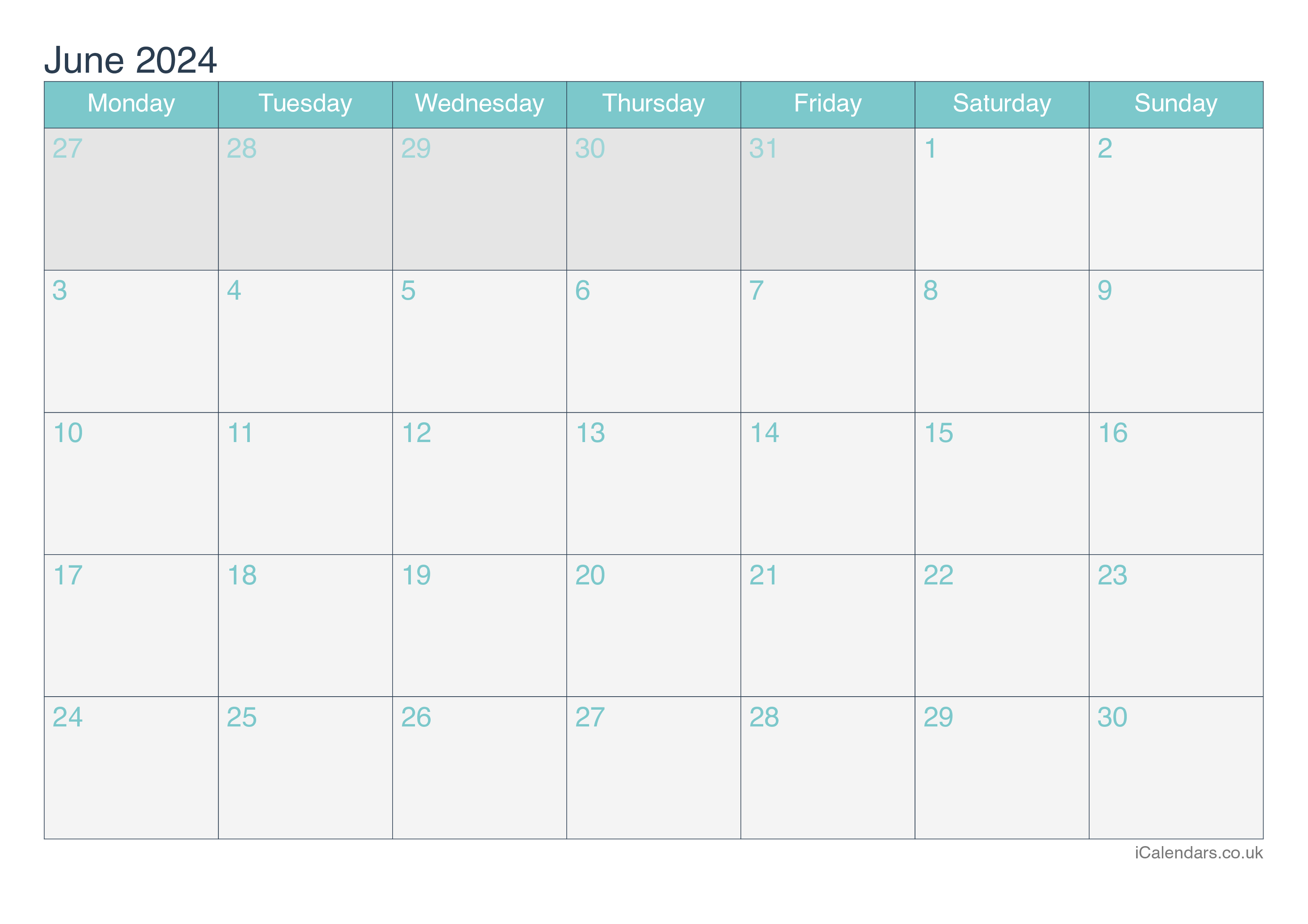 You can download and print this June 2024 calendar. It is available as an image, or in PDF and Excel formats. You can choose one of the 4 colour themes.