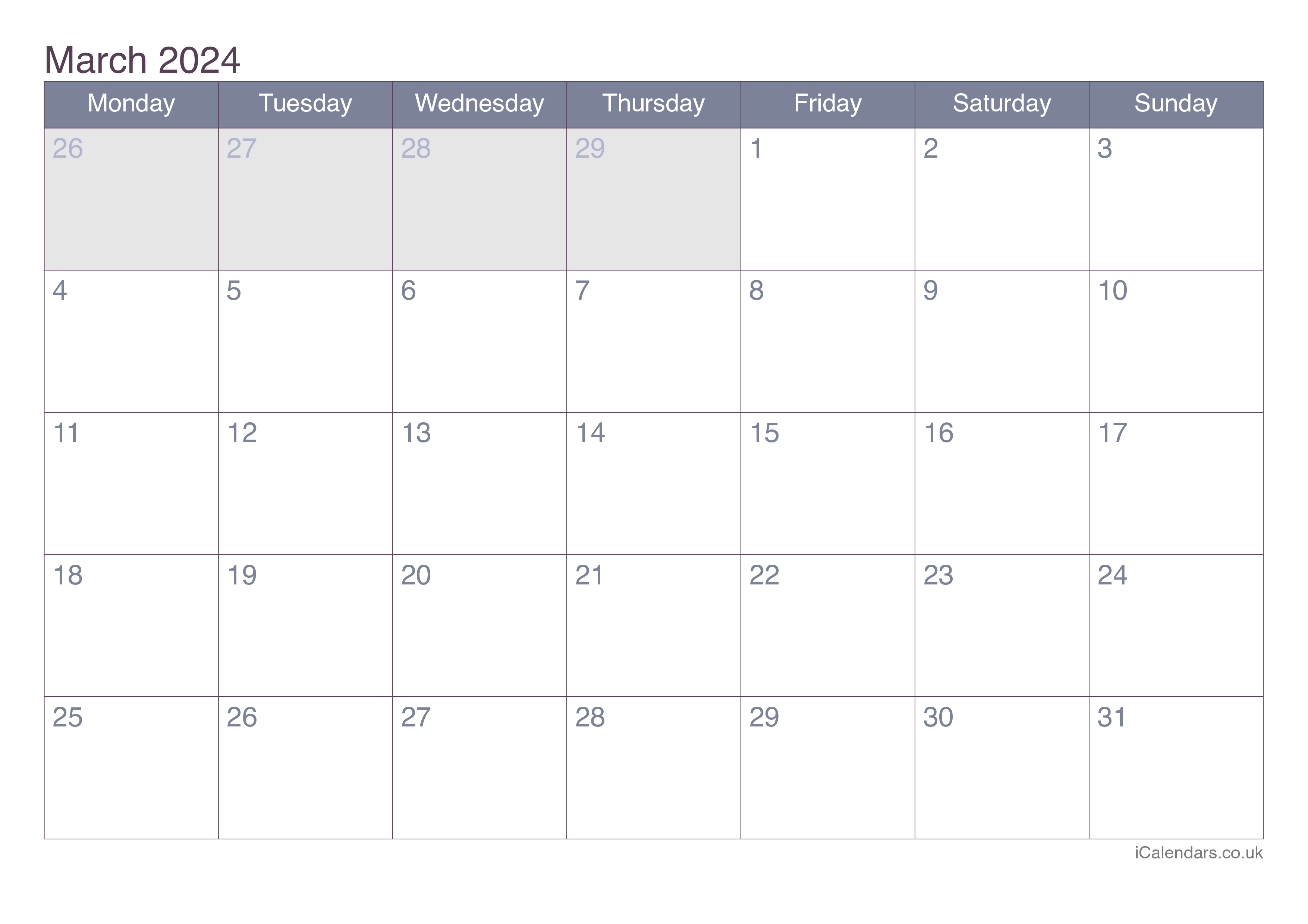 You can download and print this March 2024 calendar. It is available as an image, or in PDF and Excel formats. You can choose one of the 4 colour themes.