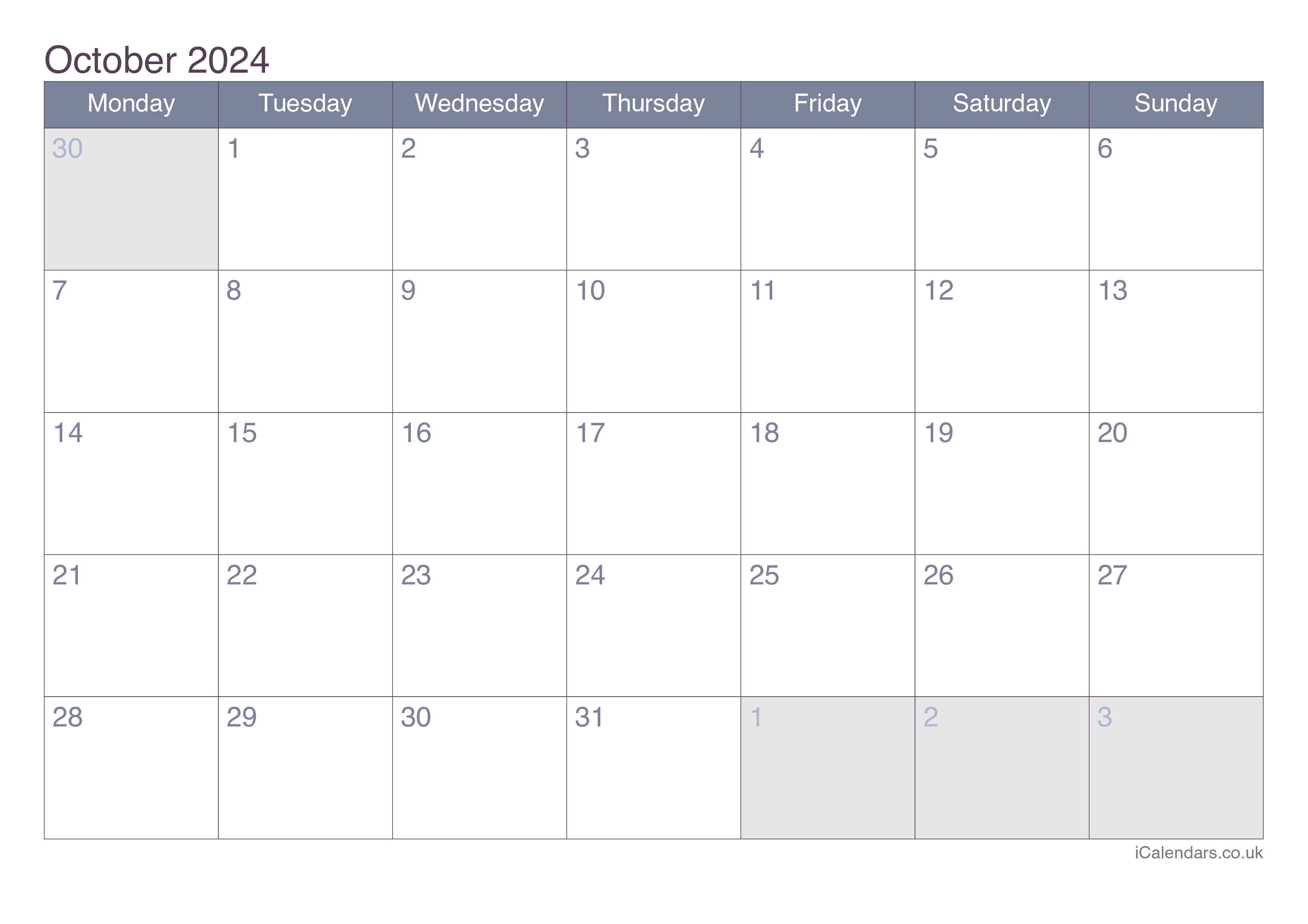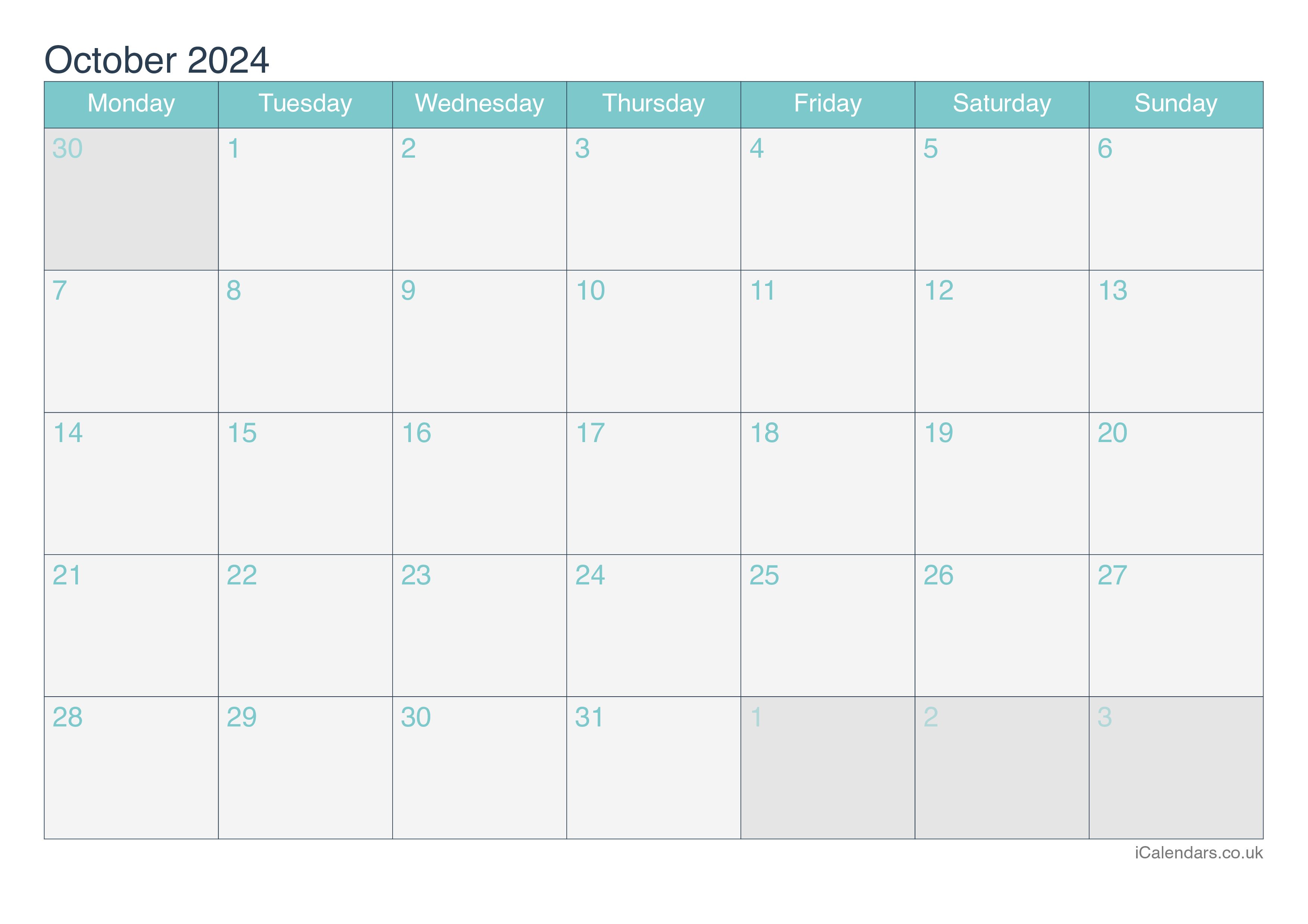 You can download and print this October 2024 calendar. It is available as an image, or in PDF and Excel formats. You can choose one of the 4 colour themes.